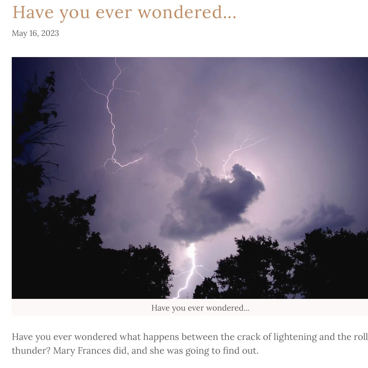 "You'll have to practice more" Orange Cat thought "I've been speaking to you for several minutes and you haven't heard a thing". "Well you have to say something I can hear first" Mary Frances pleaded. “This is a bit new to me; I've never met a thunder cat before never mind had lunch with two of them. They spread out and began telling stories for practice. We have been around for a very long time Orange Cat began; thunder cats have always been orange, could be short hair like me or long hair like Clementine but always orange. My first assignment as a tracker was to find…” and before he could go on Mary Frances was sound asleep, lulled by his soft voice and the sounds of the rushing river.